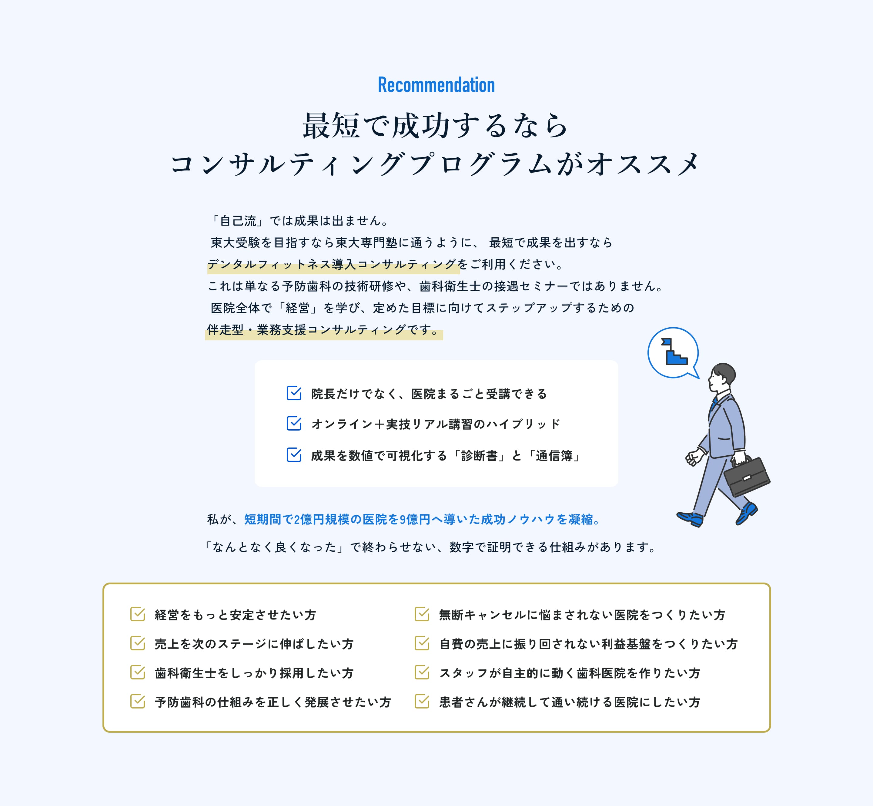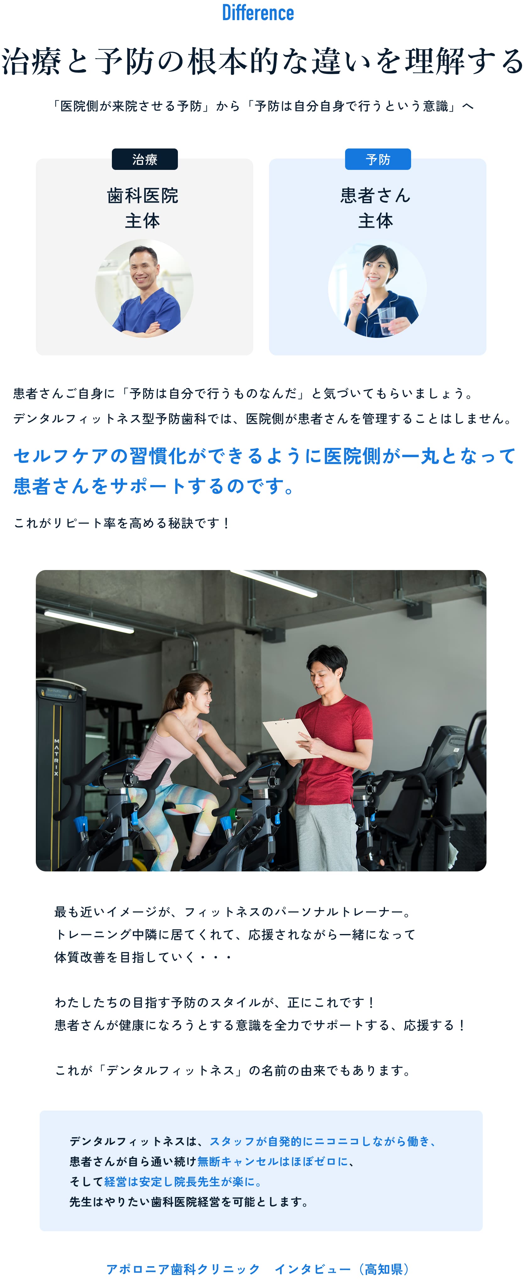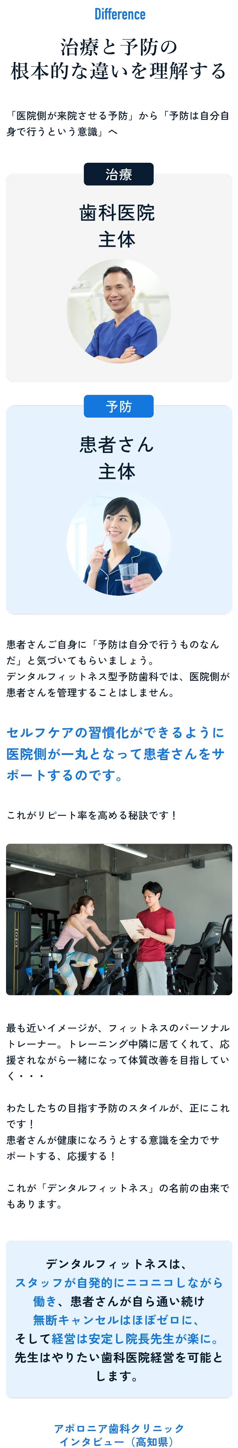治療と予防は「同じもの」ではなく、別の事業と考えるのがポイントです。担当者も考え方も対象も異なります。歯科医師が治療、歯科衛生士が予防を担う体制をつくれば、両立は十分に可能です。