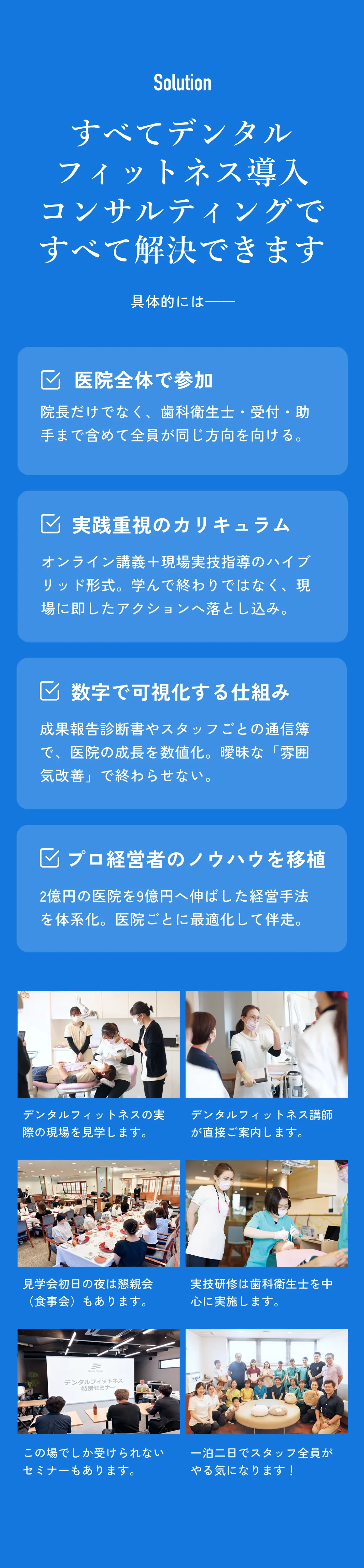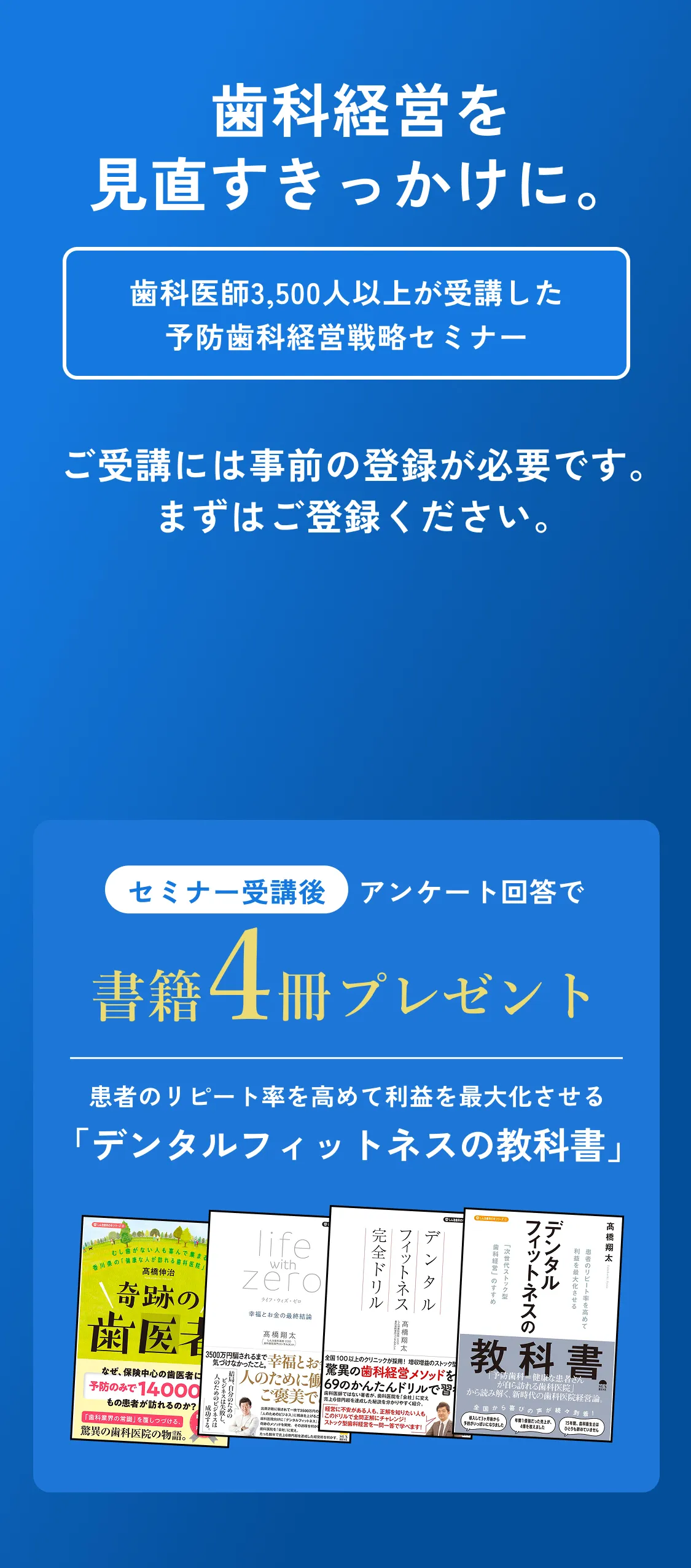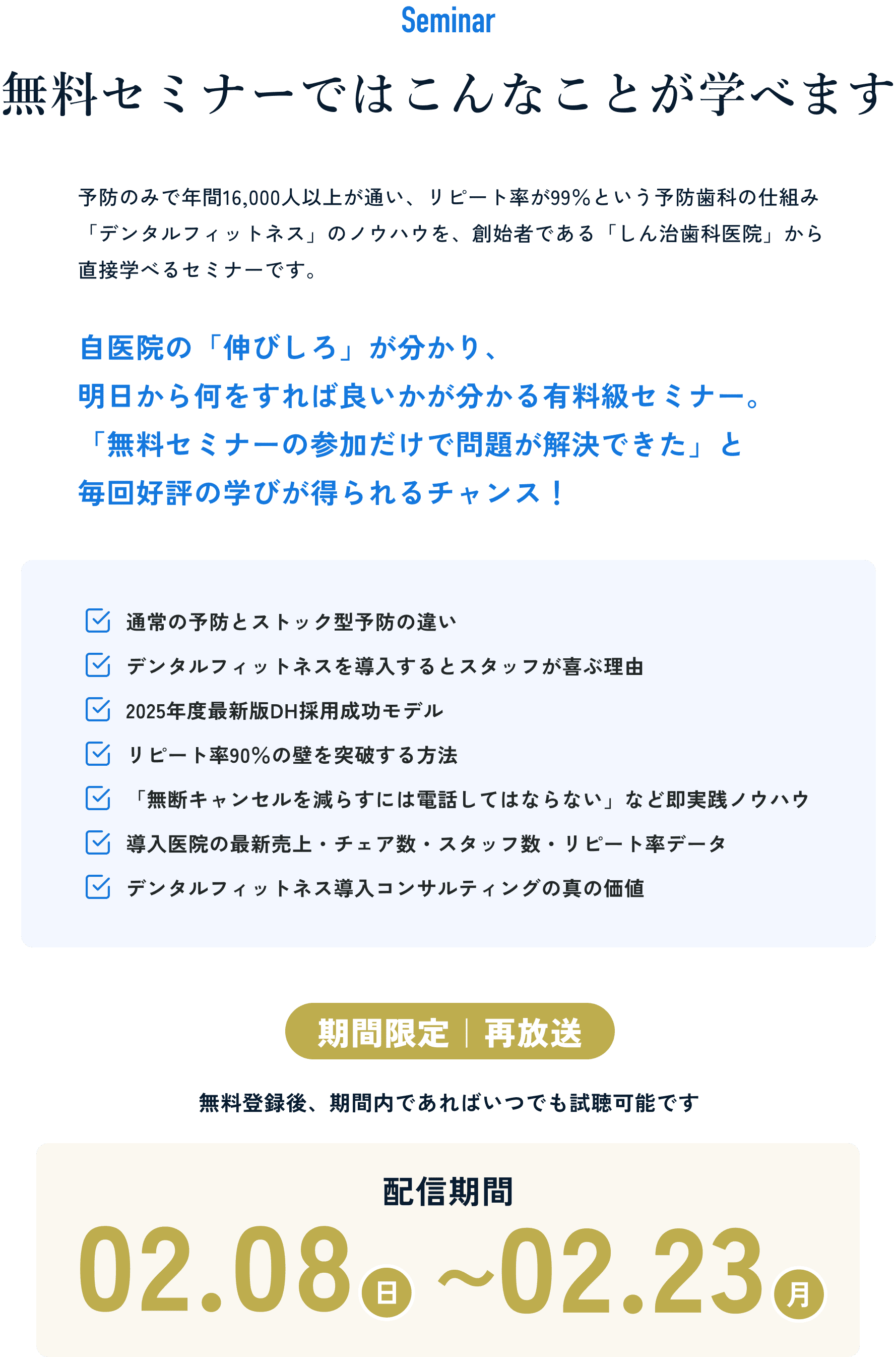 はい、無料です。セミナー後半に「デンタルフィットネス導入コンサルティング」の説明会があります。セミナーご受講後に、必要であればコンサルティングのご相談を承ります。